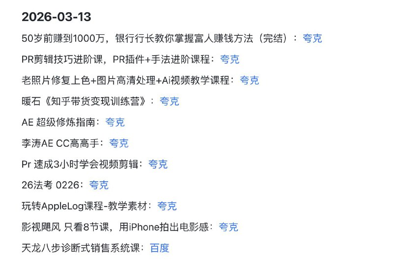 🖼 🥰2026-03-13 实用教程 1️⃣ 视频后期: Pr 速成与进阶、AE 高高手修炼教程 2️⃣ 摄影美学: iPhone 电影感拍摄、Apple Log 实战调色 3️⃣ 商业变现:…