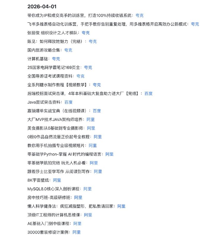 🖼 🗣️2026-04-01 实用教程 1️⃣ IT与大厂架构: Java架构师培养、MySQL 8.0、后端面试突击 2️⃣ 流量与IP变现: 0粉起号全教程、IP成交训练营、飞书自动…