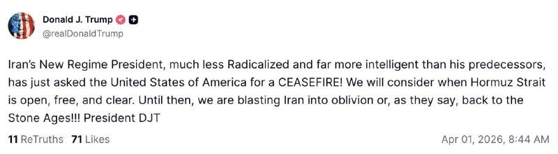 ↩️ 特朗普3月31日对不愿参战的盟友表达不满,称美国不会再帮忙,让他们自己去获取石油。特朗普说,确保海峡安全“不是我们的任务”,保持霍尔木兹海峡畅通的责…