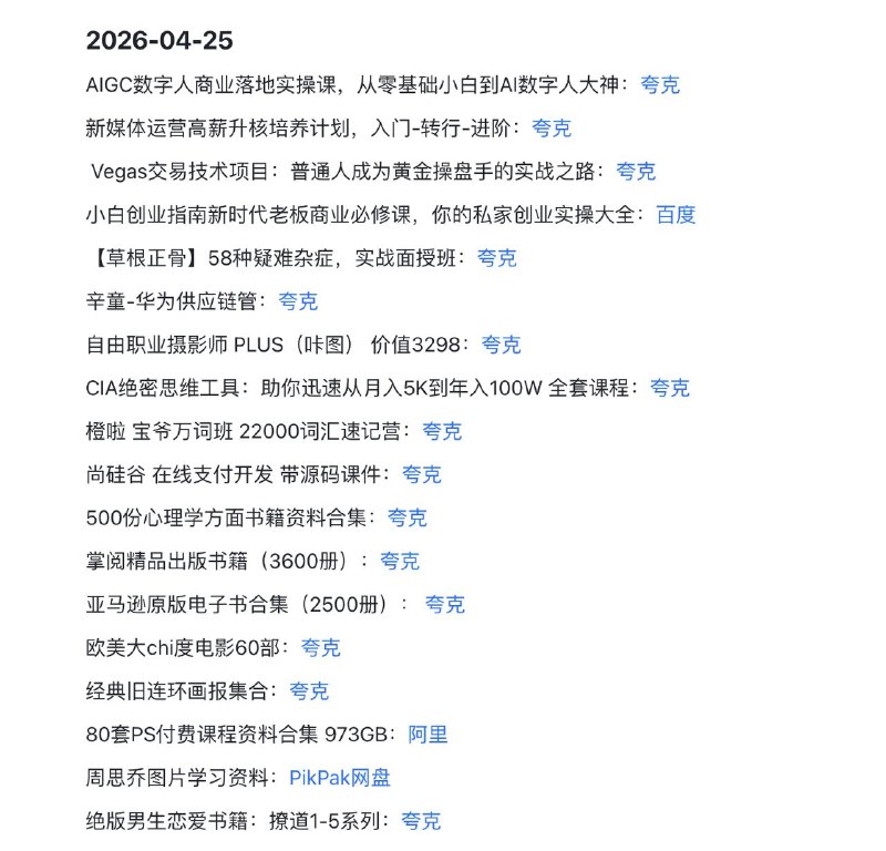 🖼 🗣️2026-04-25 实用教程 1️⃣ IT技能与前沿AI: 尚硅谷支付开发源码、AIGC数字人落地、973G超大PS精讲合集、自由职业摄影师PLUS实战 2️⃣ 商业变现与…
