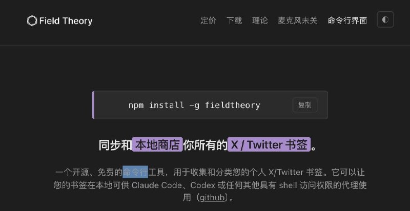 🖼 Field Theory CLI:一款开源 免费的命令行工具 能把 X/Twitter 书签同步到本地,支持 BM25 全文检索、LLM 分类、终端可视化 以及对接 Claude Code / Codex …
